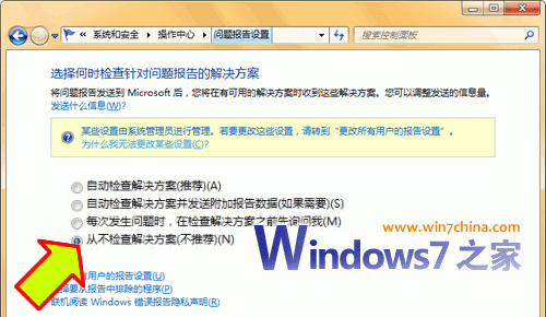 ——接下来,再点击“维护”,在展开的详细设置内容中找到并点击“检查问题报告的解决方案”下方的“设置”,在弹出页面内选择“从不检查解决方案(不推荐)”,点击“确定”就可以禁用错误报告了。